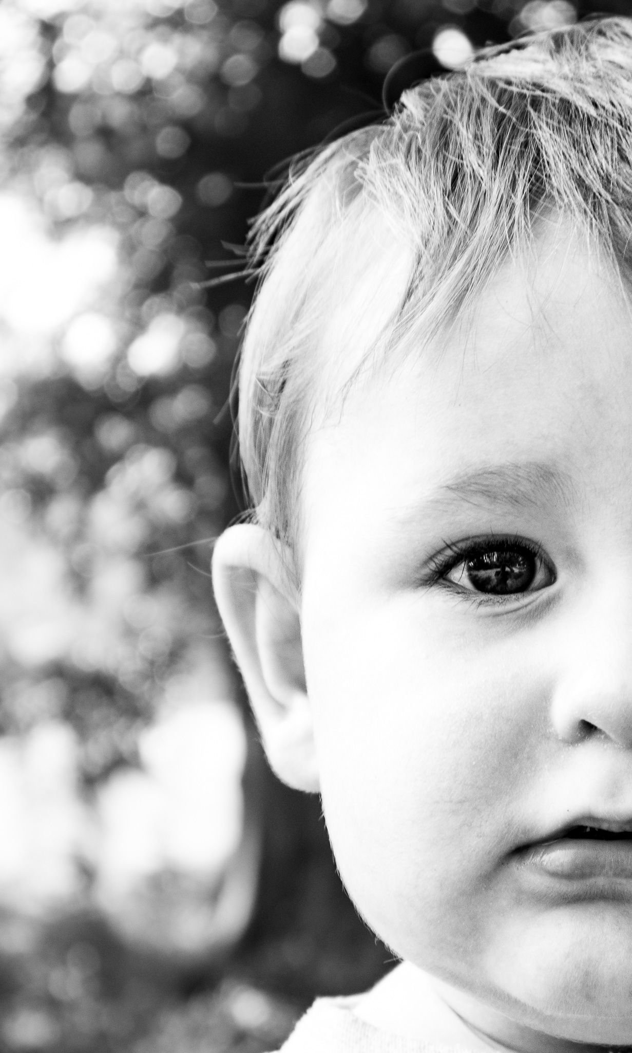 The photo is centered on half of a little boy’s face, softly surrounded by greenery.