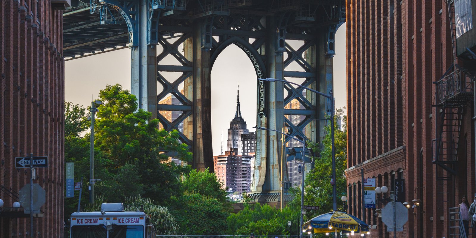 By positioning myself in the exact center of Washington Street, I wanted to use the Manhattan Bridge as a literal window into the past. The bridge, with its heavy industrial rivets and cold blue-grey steel, represents the strength and grit of the city's infrastructure. But tucked perfectly within its arch is the spire of the Empire State Building, glowing with an elegance that has defined the skyline for nearly a century.