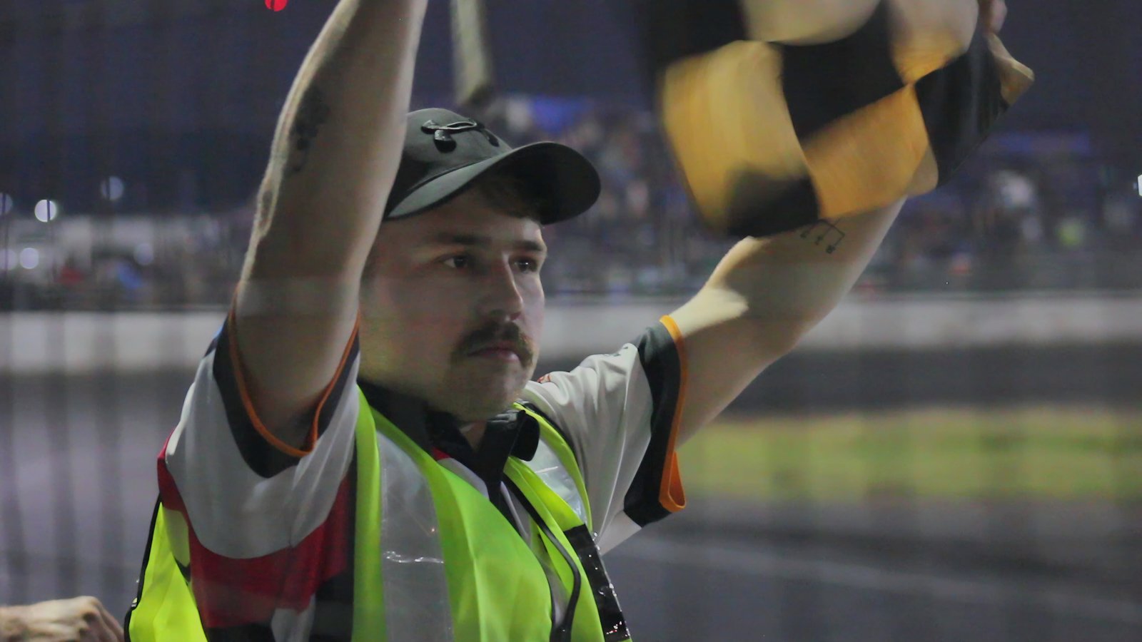 The image captures the pure emotion of anticipation of flagman right before he has to wave the checkered flag. He timing has to be correct, The circuit is short (oval racing) and theres only 10 laps, he counts as the leading car passes by him exactly 9 times, and the 10th time he has to pick up the flag and that signs the end of the race. 1 lap to early or to late and it courses chaos.