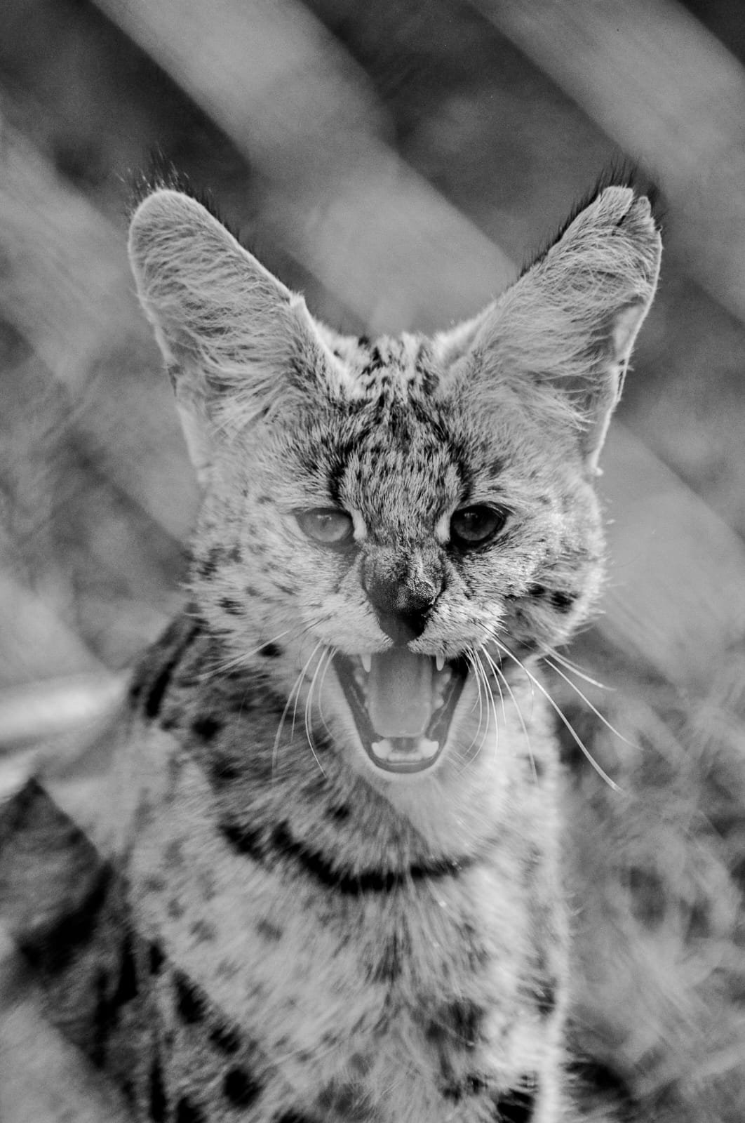 It looks like a young serval caught in a moment of raw emotion, mouth open, almost like a mix between a warning and a cry. One eye is cloudy, which hints at past injury or hardship, while the other is sharp and alert. It doesn’t feel staged, it feels real. Like a brief glimpse of a wild animal that’s had to survive on its own, reacting instinctively. Scared ...
