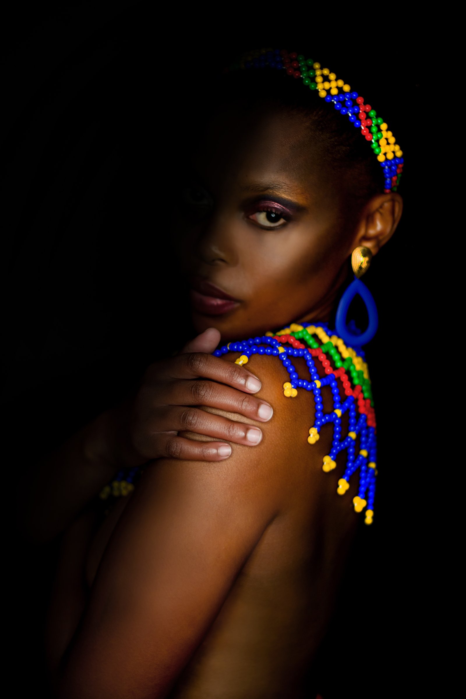 the quiet, where shadows felt like home, she stood wrapped in stories older than words. The beads along her shoulders weren’t just decoration; they carried echoes—of laughter around fires, of songs sung by women who came before her, of hands that once wove meaning into color. Blue for strength. Yellow for joy. Green for life. Red for the fire that refuses to die.